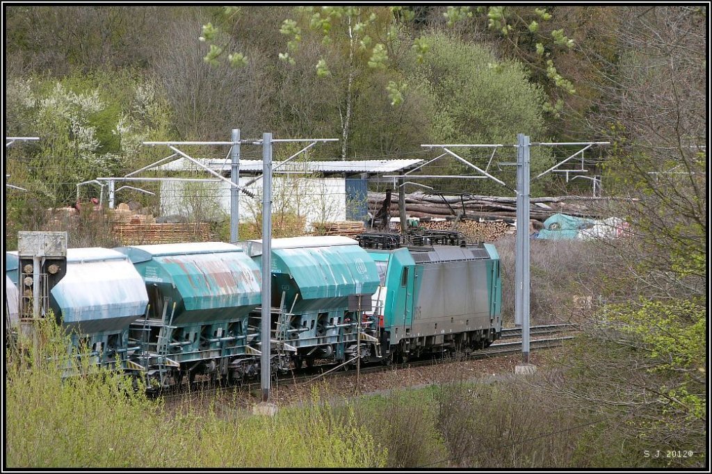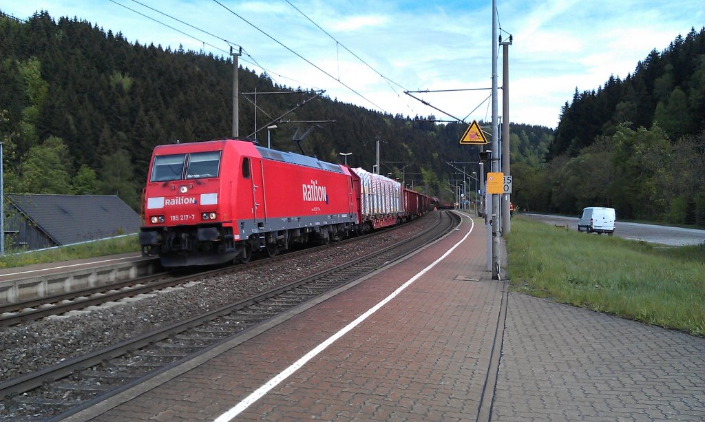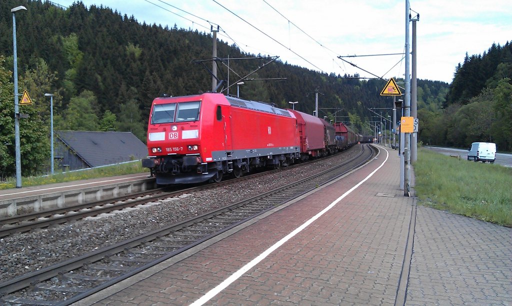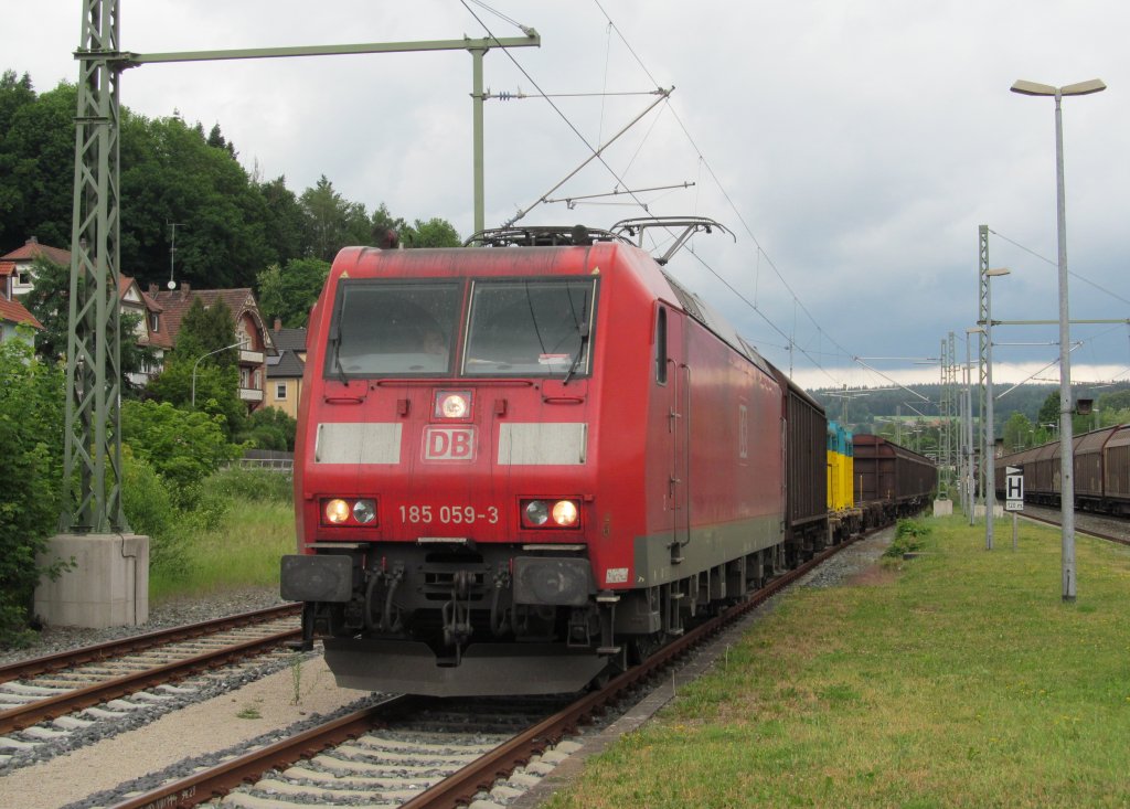 185 059-3 steht am 1. Juni 2012 mit einem gemischten Güterzug auf Gleis 5 in Kronach.