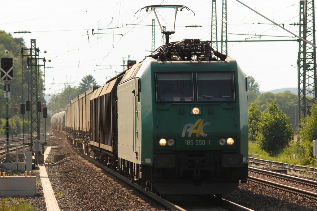 185 546-9 der OHE ist mit einem Schiebewandwagenzug am 01.06.2012 in Ladenburg