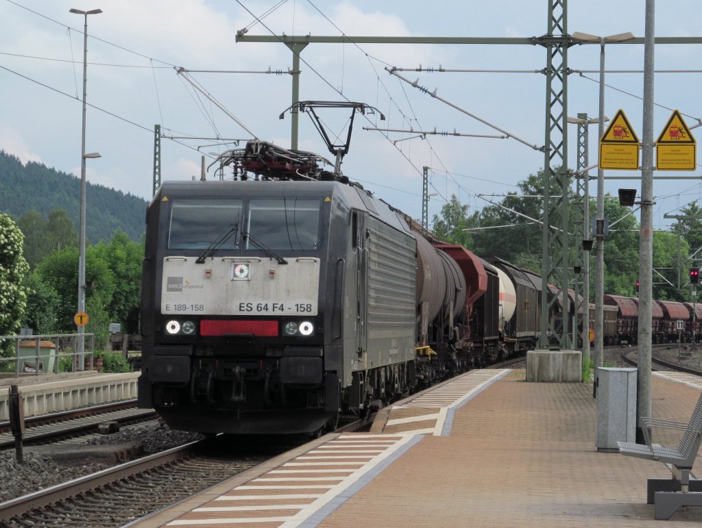189 158 der MRCE zieht am 1. Juni 2012 einen gemischten Güterzug durch Kronach in Richtung Saalfeld.