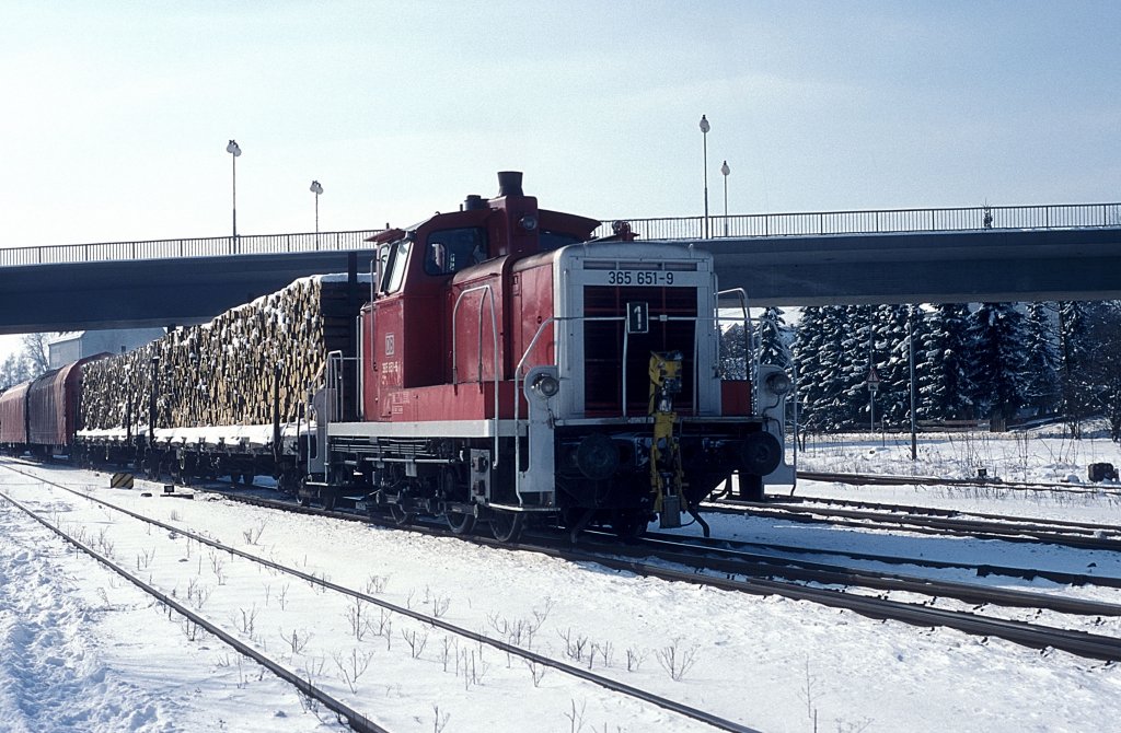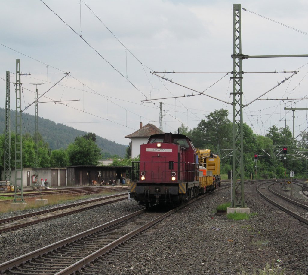 203 007-0 der Bocholter Eisenbahngesellschaft zieht am 1. Juni 2012 einen Baukran durch Kronach in Richtung Saalfeld.