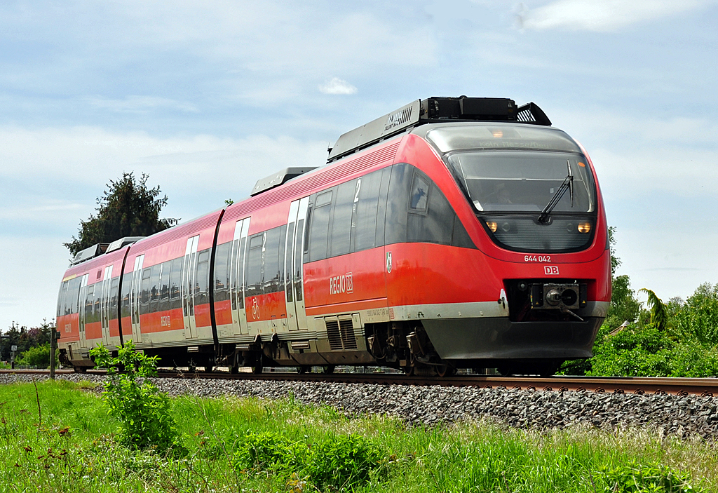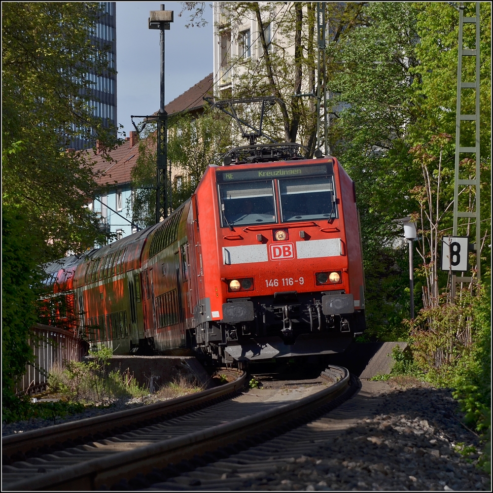 Linksdrall für Marc und Matthias... ;-) Hier die gleiche Stelle wie beim Bild mit dem 611. Die Strecke sieht schief aus, während die Häuser im Hintergrund die Wahrheit erzählen, diesmal habe ich auch auf ganz korrekte Umsetzung geachtet. RE Karlsruhe-Kreuzlingen kurz vor Querung des Rheins im Mai 2012.