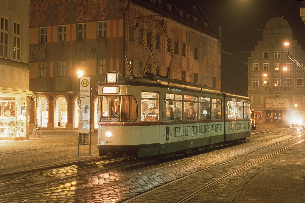 Augsburg Tw 538 an der Hst. Moritzplatz in der Bürgermeister Fischer Straße, 25.02.1999.