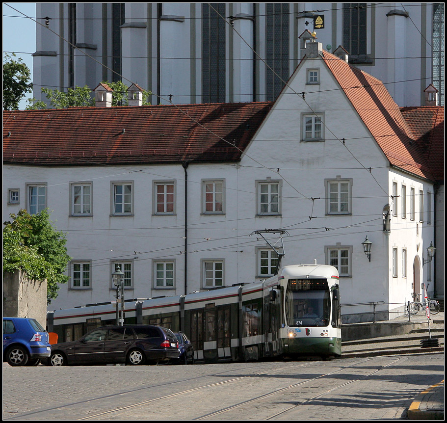 Die CityFlex-Straßenbahn erreicht am Ende des steilen Milchberg den Ulrichsplatz.