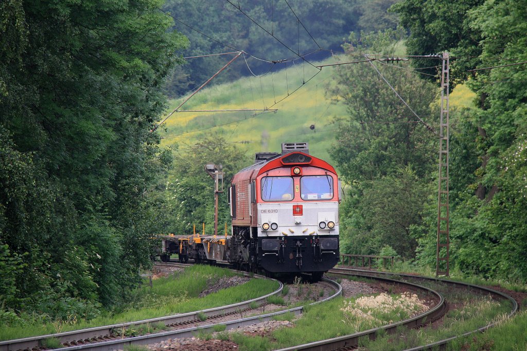Die Class 66 DE6310 "Griet" von Crossrail kommt die Gemmenicher-Rampe hochgebrummt mit einem Containerzug aus Aachen-West und fährt in Richtung Montzen/Belgien und fährt gleich in den Gemmenicher-Tunnel hinein.