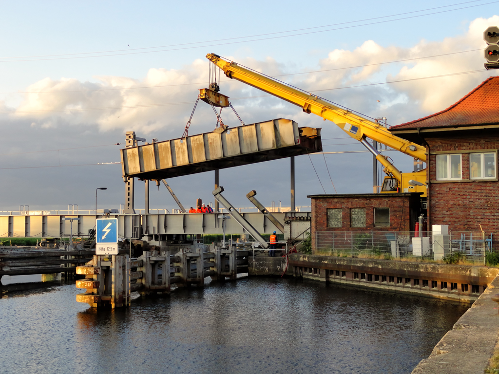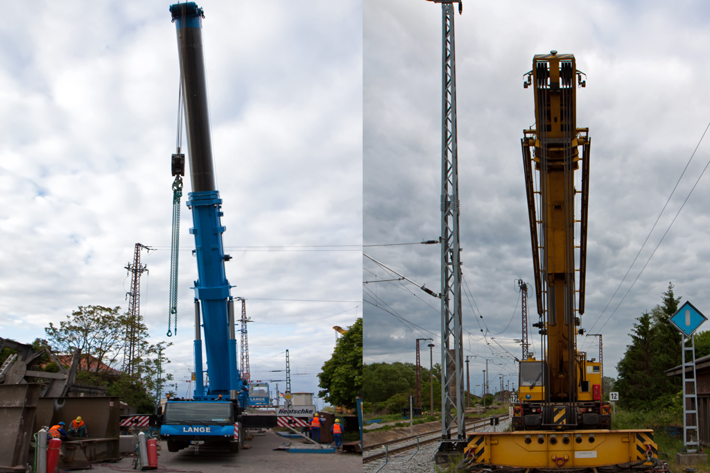Rückbau des letzten Brückensegments der alten Anklamer Eisenbahnbrücke. Zum Einsatz kam ein Schienenkran der Hering - Bau & Co KG und danach übernahm ein Teleskopautokran der Fa. Lange. - 30.05.2012