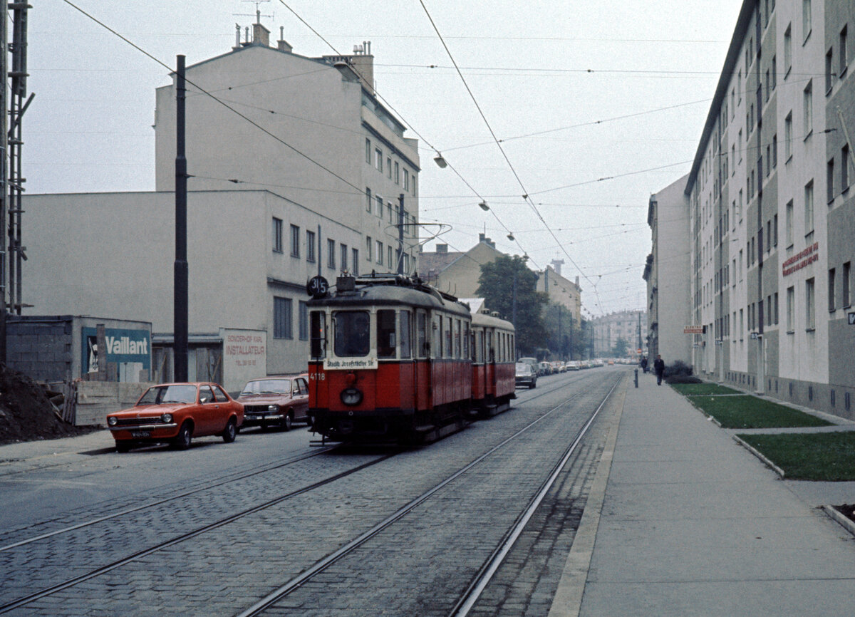 Eine Combino-Tram der Linie 13 biegt hier vom engen Schmiedberg in die Karolinenstraße ein.