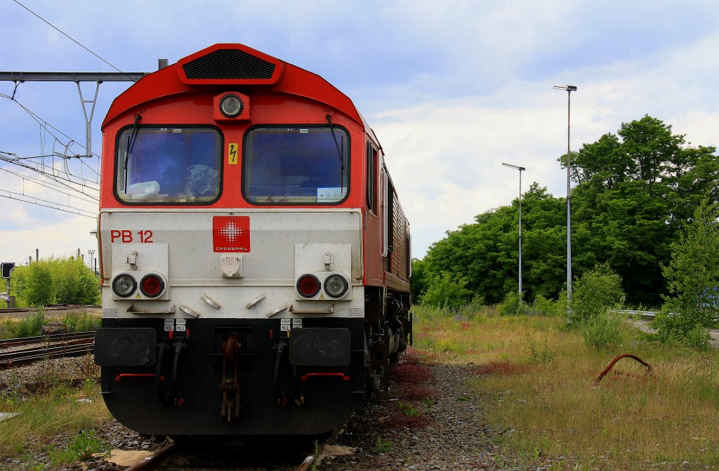 Die Class 66 PB12 "Marleen" von Crossrail steht in Montzen-Gare(B) bei Wolken am 10.6.2012.