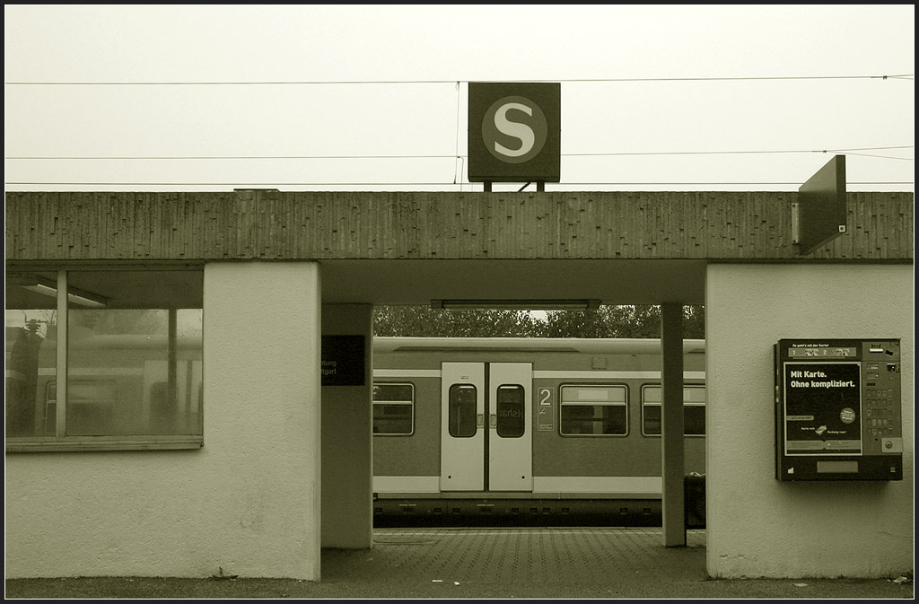 . Mit Karte, Ohne kompliziert - Dies gilt vielleicht für den Zigarettenautomaten, nicht für alle für die Fahrkartenautomaten. Eingang zum S-Bahnhof "Rommelshausen". Nach links gehts runter zur Unterführung. Rechts hinter der Wand gibt es eine Sitzgelegenheit und befindet sich der Fahrkartenautomat. Das Bauwerk ist nach rein funktionalen Gesichtspunkten gebaut, ohne jeden ästhetischen Anspruch. 01.11.2007 (Matthias)