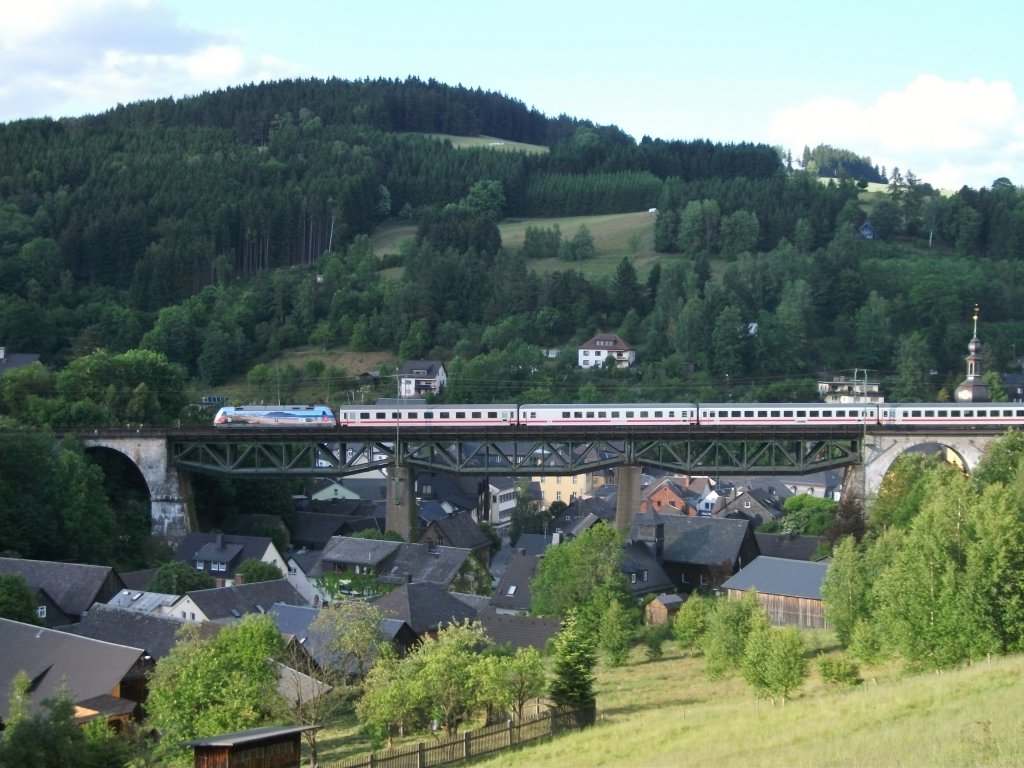101 118 "Packendes Südafrika" schiebt den IC 2209 am 09.Juni 2012 über das Trogenbachviadukt in Ludwigsstadt.