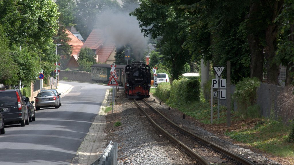 14:26 Uhr startet P 3008 , am 12.06.2012 mit 99 1775 - 8 als Zuglok in Radebeul Ost zur Fahrt nach Radeburg. Kurz vor dem Haltepunkt Weißes Roß ist ein Steigung so daß sich die Lok mit hallenden Auspuffschlägen nähert.