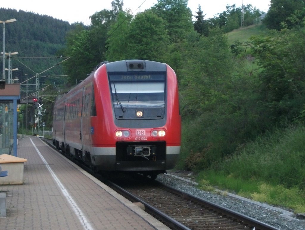 612 064 fährt am 09.Juni 2012 als RE nach Jena Saalbahnhof Auf Gleis 3 in Ludwigsstadt ein.