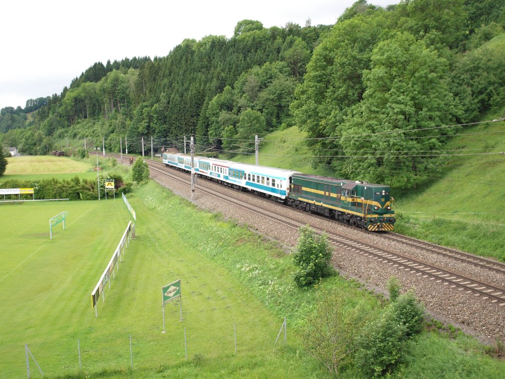 Retourfahrt unserer slowenischen Freunde mit ihrem Sdz R 14869 von Mürzzuschlag nach Laibach am 10.6.2012, wegen Überhoung durch den EC 159 "Croatia" leider am Gegengleis, kurz vor Bruck an der Mur bei der Querung der Mürz.
