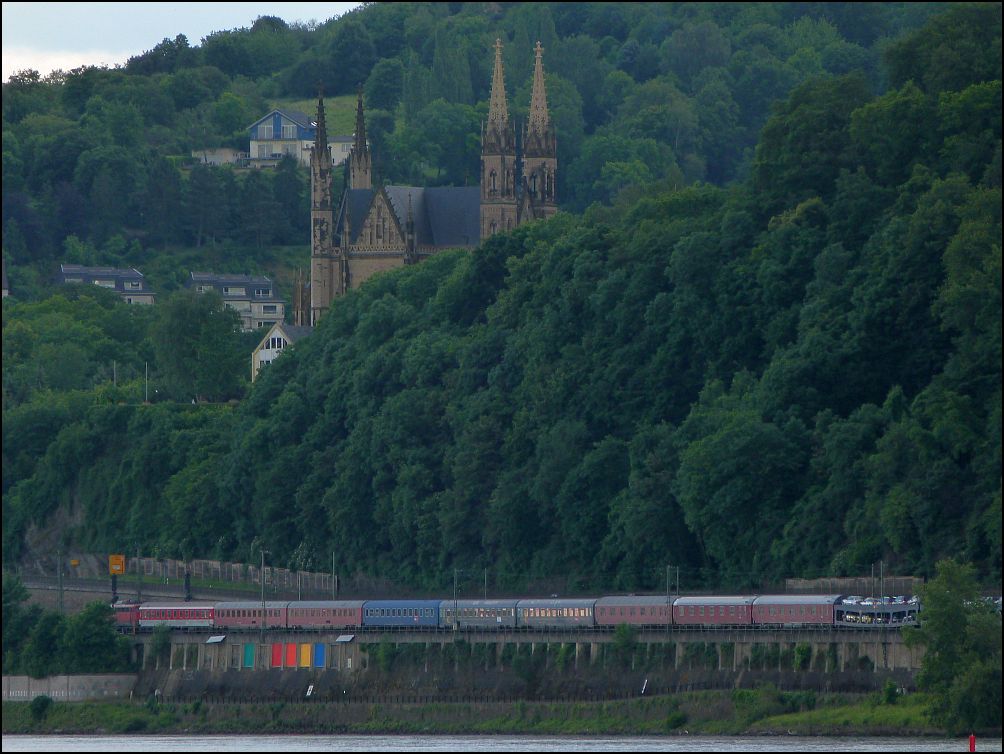 Ab in den Süden geht es für diesen Autoreisezug, gesehen am Rheinufer bei Remagen.