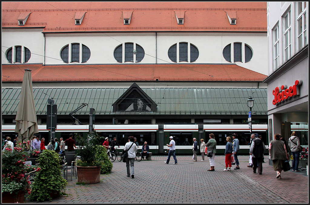 Ganz unauffällig und selbstverständlich ohne zu stören fügt sich die Straßenbahn hier in die städtische Szenerie ein am Moritzplatz ein. Im Hintergrund die Moritzkirche.