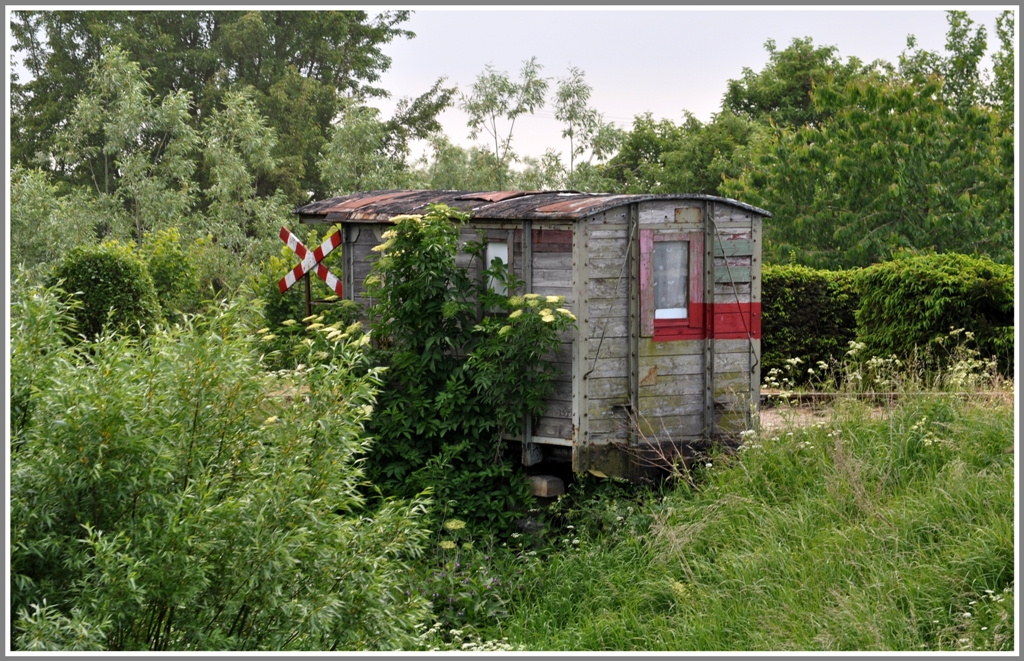 Der ausrangierte Güterwagen dient dem Brückenposten bei Rybina am Fluss Skarpawa offenbar als vorübergehende Bleibe. (07.06.2012)