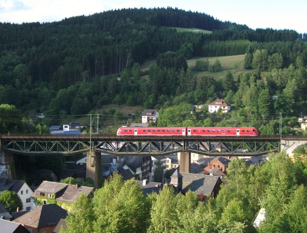 Ein 612er überfährt am 09.Juni 2012 als RE nach Lichtenfels das Trogenbachviadkut in Ludwigsstadt