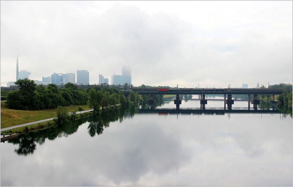 Eine besondere Stimmung bot sich am Morgen des 10. Juni 2012 an der Donau in Wien, als sogar der Donauturm hinter den Wolken verschwand. An dieser vorbei fuhr die 1040 013 mit dem EZ Leiser Berge Richtung Korneuburg.