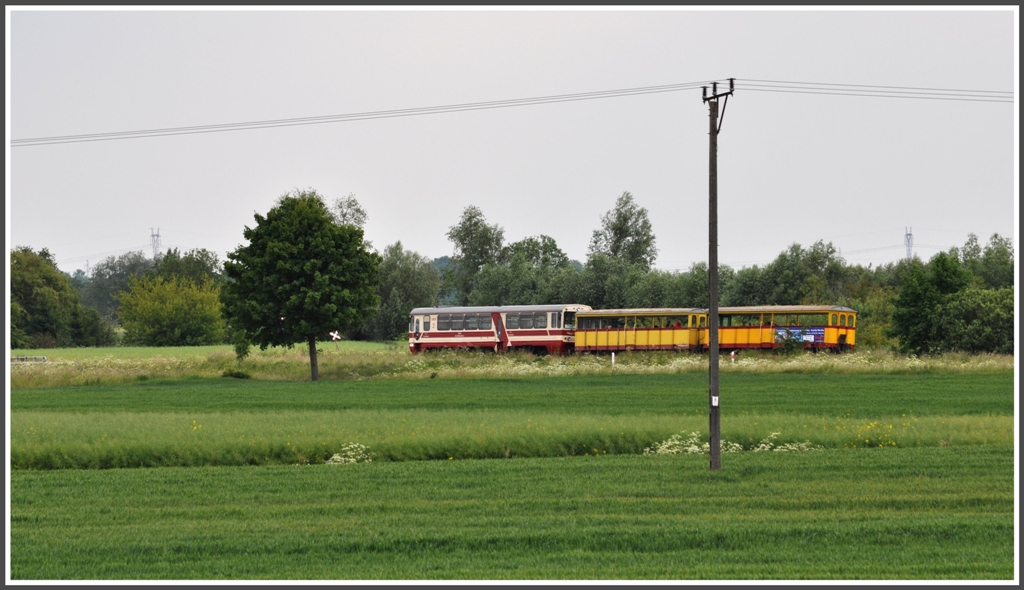 Etwa 40km östlich von Gdansk/Danzig gab es im Raum Nowy Dvor Gdanski ein grosses Schmalspurnetz. An Sonn- und allgemeinen Feiertagen findet offenbar noch ein beschränkter Ausflugsverkehr statt. So auch an Fronleichnam, als plötzlich ein Zug unseren Weg kreuzte bei Rybina. Fotografiert vom Oberdeck unseres Schiffes auf dem Fluss Skarpawa.(07.06.2012)