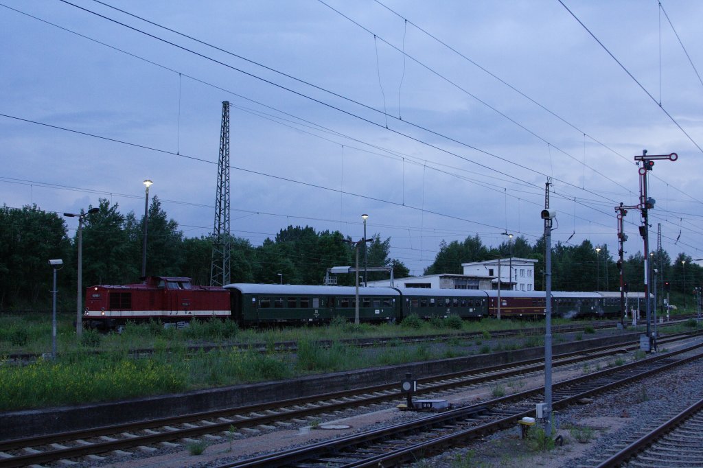 Hauptbahnhof Zwickau am frühen Morgen des 09.06.2012. Im Hintergrund steht 112 565 der PRESS mit einem Sonderzug, gebildet aus dem Wagenpark des Vereins Sächsischer Eisenbahnfreunde (VSE). Der Zug wird gerade für seine Fahrt nach Wernigerode und Bad Harzburg vorbereitet.