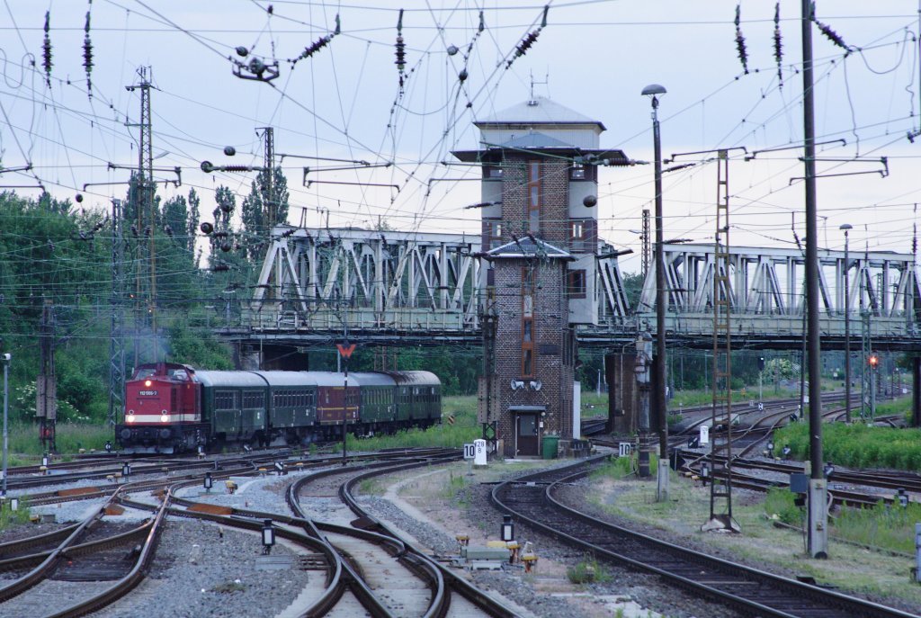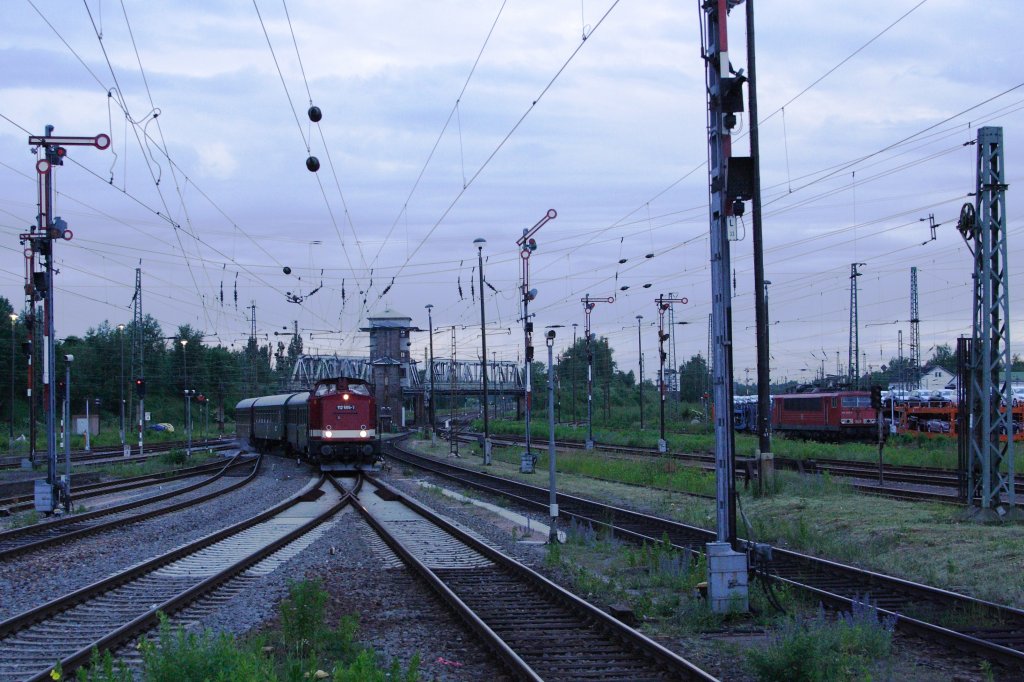Hauptbahnhof Zwickau am frühen Morgen des 09.06.2012. 112 565 rangiert mit einem Sonderzug der PRESS und des VSE mit Ziel Wernigerode und Bad Harzburg und wird ihn gleich auf Gleis 3 des genannten Bahnhofes bereitstellen.