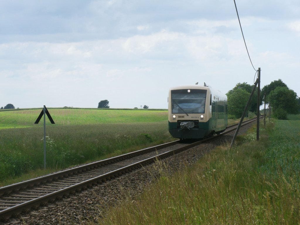 PRE 81275 Bergen/Rügen-Lauterbach Mole,gefahren vom PRESS VT650 032,am 09.Juni 2012,über Rügen`s Flachland zwischen Bergen und Putbus.
