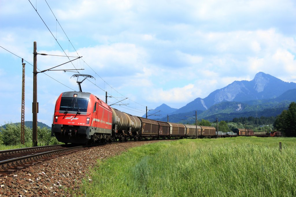 Am 07.06.12 kamen 541 105 und 1116 125 mit dem DG 45419 Villach Süd Gvbf-Ausfgr - Ljubljana Zalog in Finkenstein vorbei.