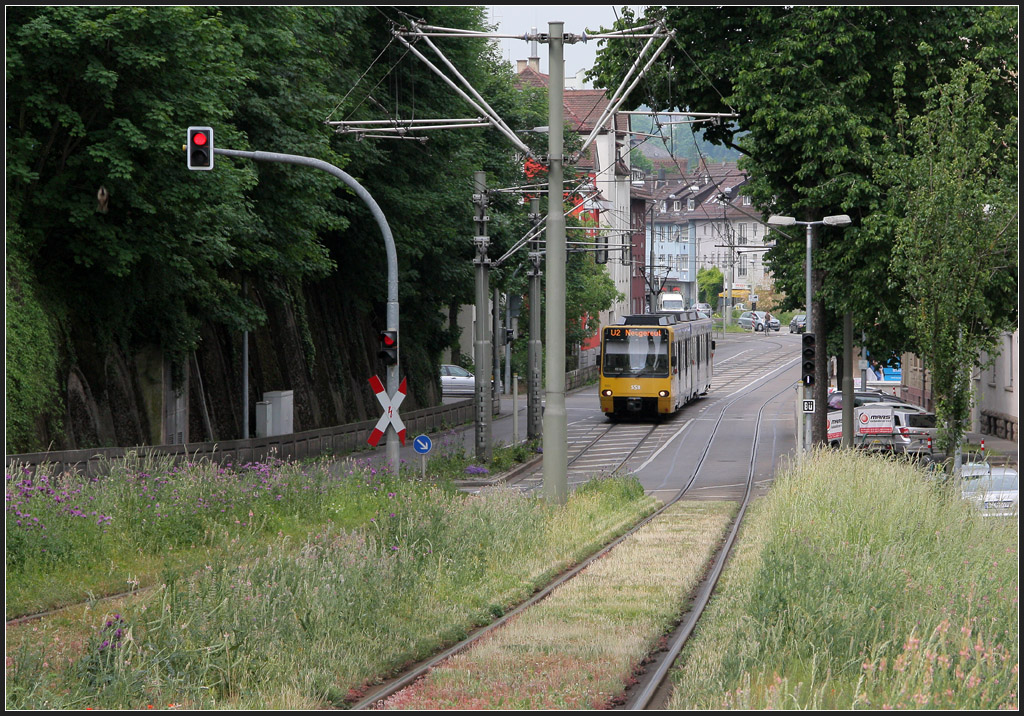 . Der Übergang auf die Wiese - In Höhe des Bahnviaduktes der Schusterbahn war dann ausreichend Platz vorhanden um für die Stadtbahn einen eigenen Bahnkörper anzulegen, der wie es in Stuttgart inzwischen Standard geworden ist, als Rasenbahnkörper ausgeführt wurde. Die U2 neben der Schmidener Straße in Stuttgart-Bad Cannstatt. 31.05.2012 (M)