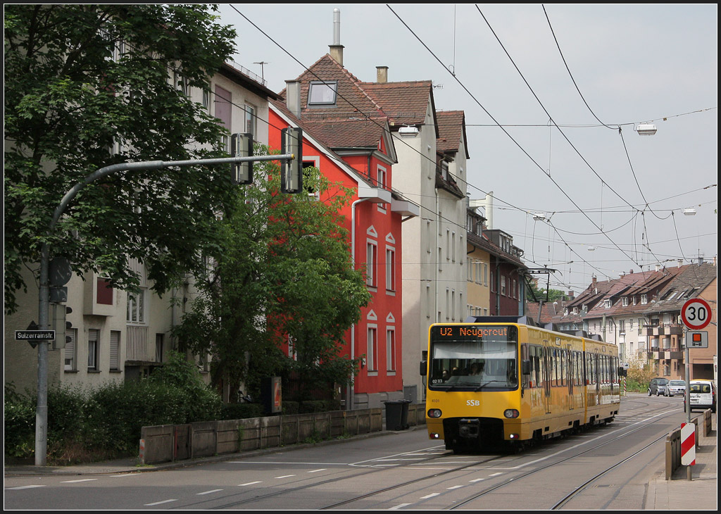 . Die Stadtbahn als Straßenbahn - Im unteren Teil der Schmiedener Straße hat der Platz beim Stadtbahnausbau nicht gereicht um für die Linie U2 hier einen eigenen Bahnkörper anzulegen. Nur stadtauswärts konnte das Gleis abmarkiert werden. 31.05.2013 (M)
