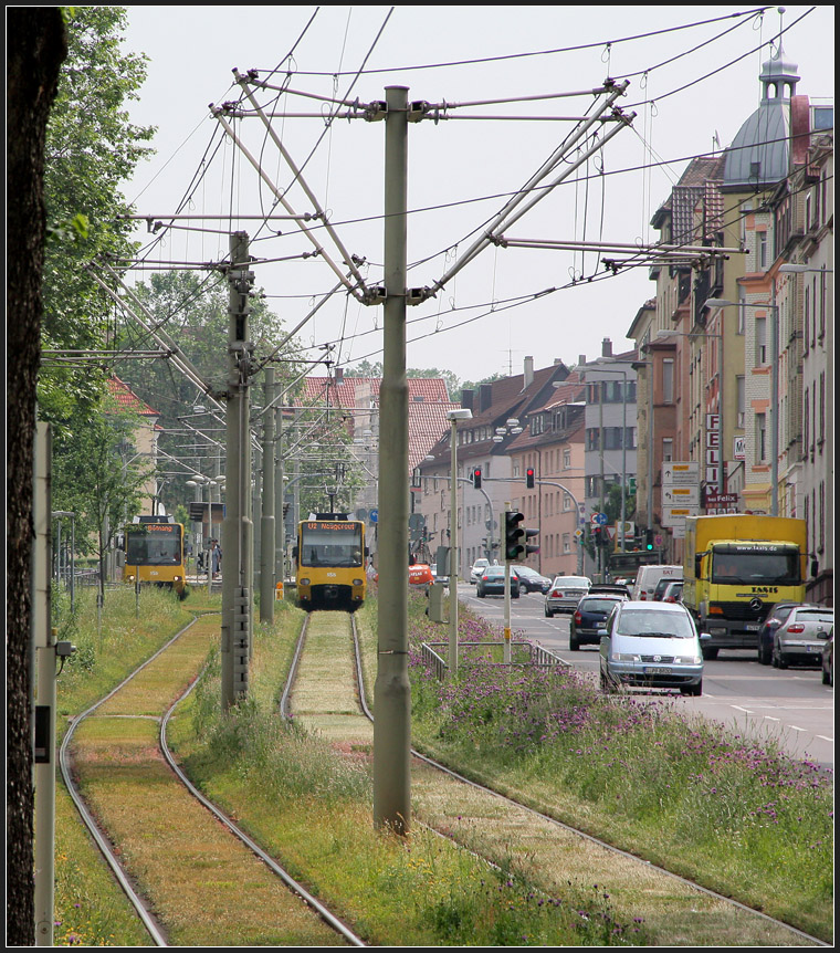 . Grüne Gleise, aufwändige Fahrleitungsanlagen - Blick auf den Rasenbahnkörper entlang der Schmidener Straße. Das Bild wird etwas getrübt durch die für die Stadtbahn notwendigen Hochkettenfahrleitungsanlagen. U2 in Stuttgart-Bad Cannstatt. 31.05.2012 (M)