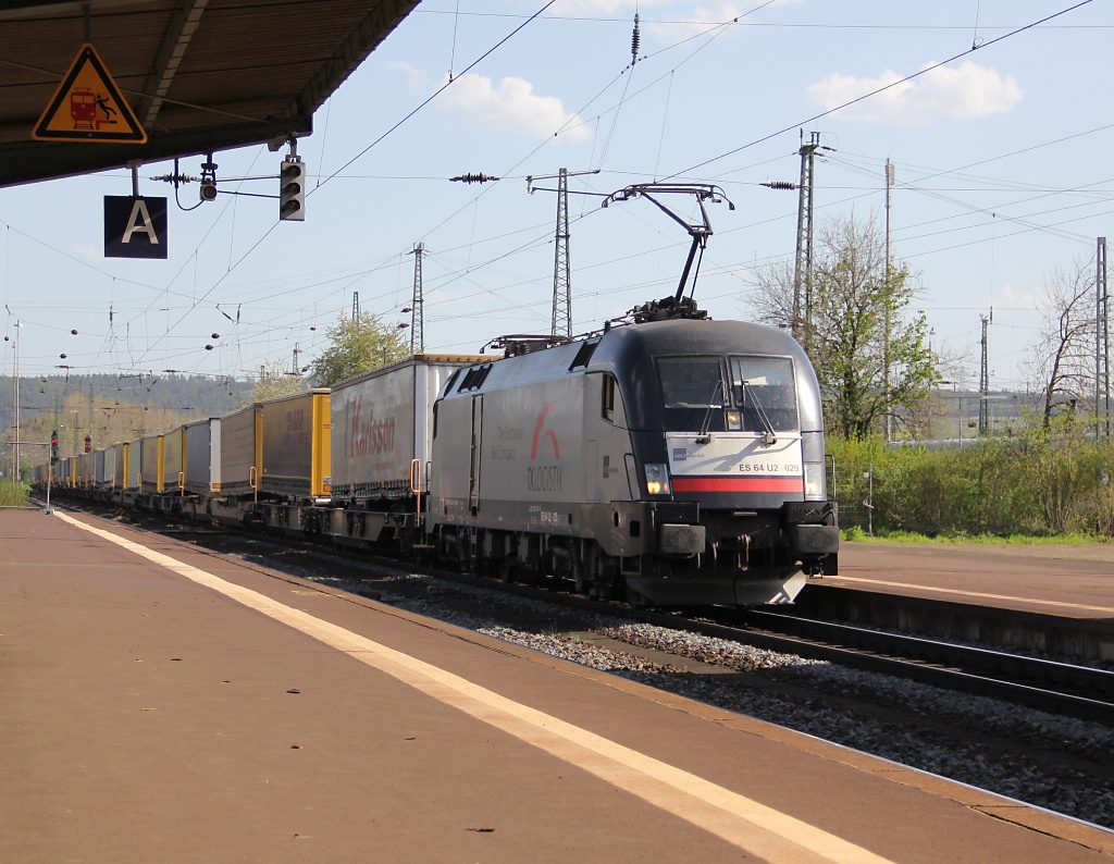 Die ES 64 F4-092 und die ES 64 F4-082 mit einem KLV-Zug am 25.04.2012 unterwegs bei Silenen.