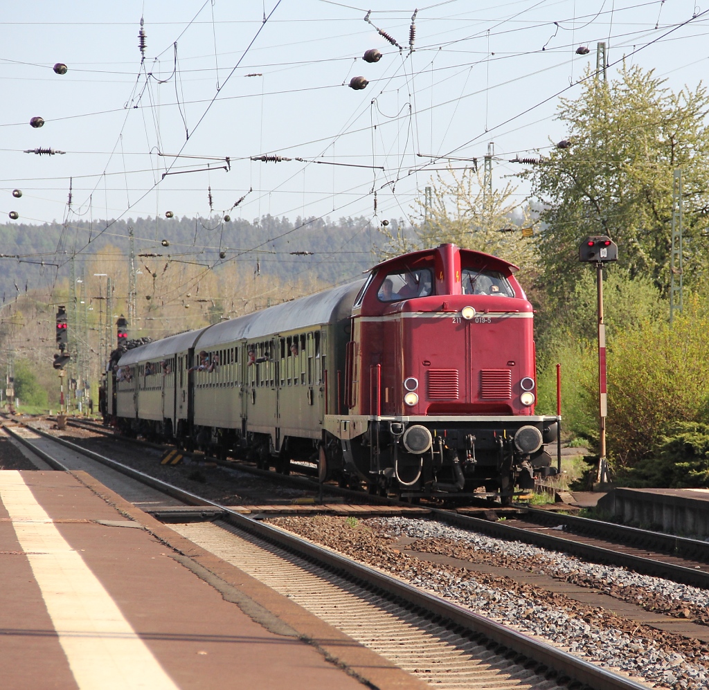 211 019-5 und 50 3610 kommen von einem kleinen Abstecher zurück nach Bebra. Aufgenommen am 28.04.2012.