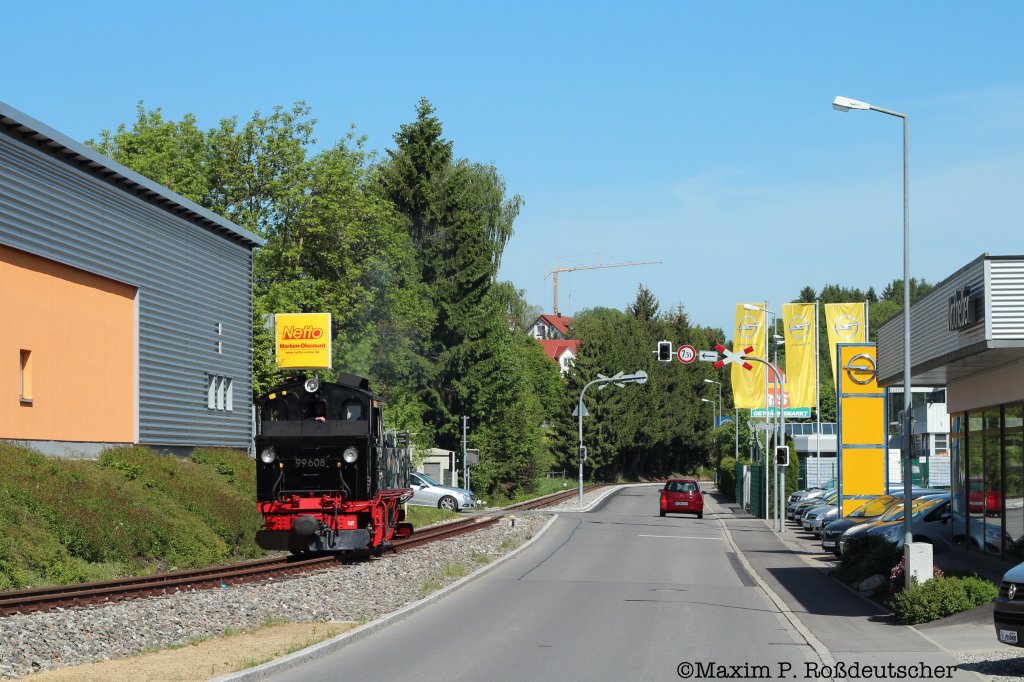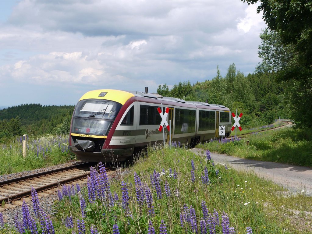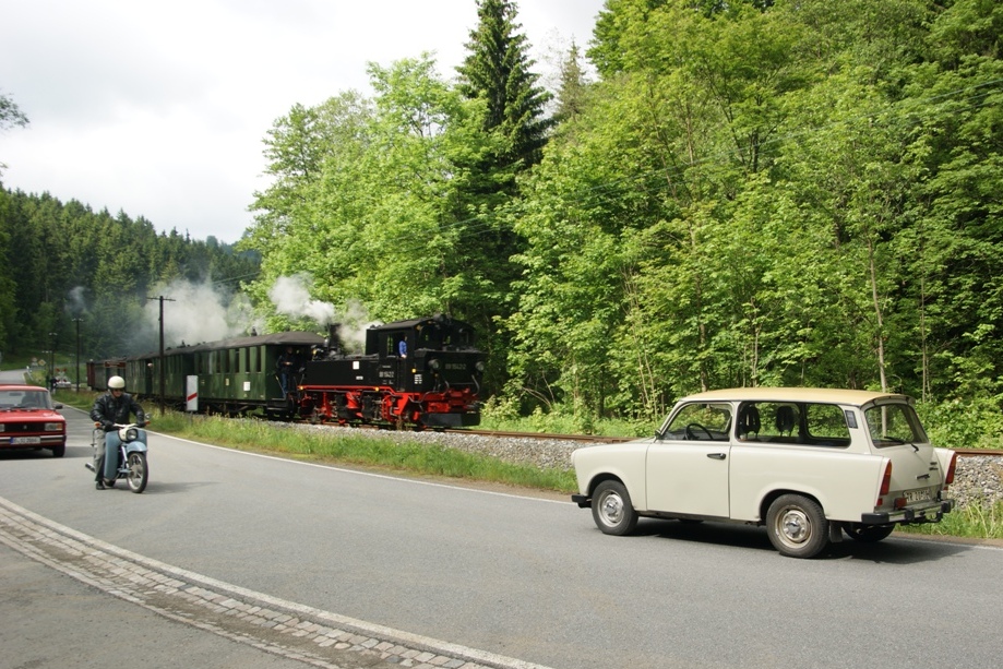 99 1542-2 mit einem GmP an der Grumbacher Kreuzung. Leider mußte der Lada geschnitten werden, da ich sonst zu viele  Gäste  auf dem Bild hätte. Aufgenommen am 01.06.2012.