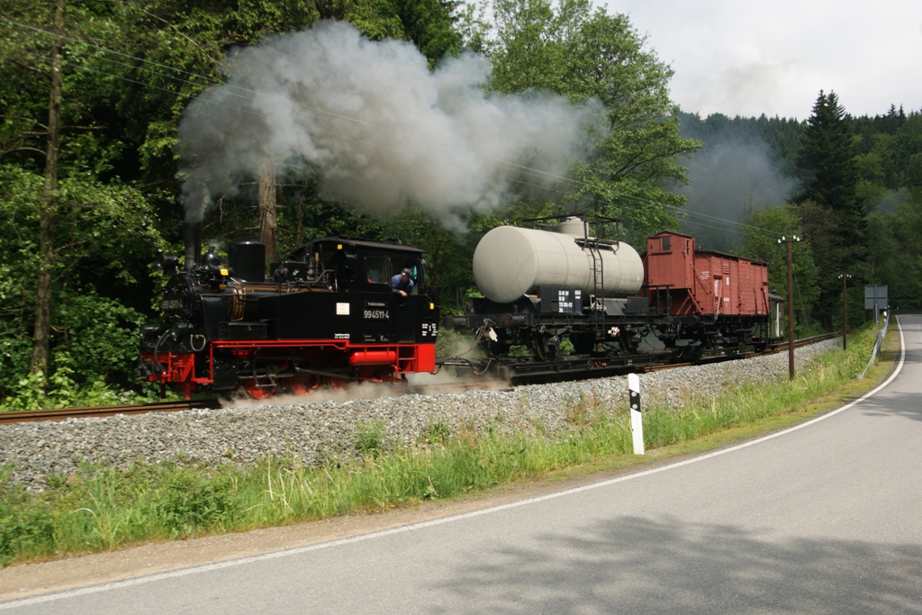 99 4511 mit einem Dstg zwischen Hp Stolln und Hp Forellenhof kurz vor der Grumbacher Kreuzung. Aufgenommen am 01.06.2012
