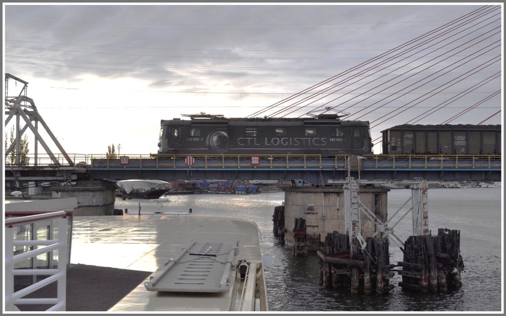 Die Lichtverhältnisse sind noch etwas diffus an der toten Weichsel, als 182 052-1 unseren Weg kreuzt. (03.06.2012)