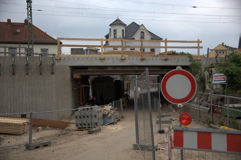 Die seit einigen Tagen rohbaufertige Brücke Hainstraße in Radebeul West. 13.06.2012 gegen 17:50 aufgenommen. Noch sieht es baustellentypisch aus.