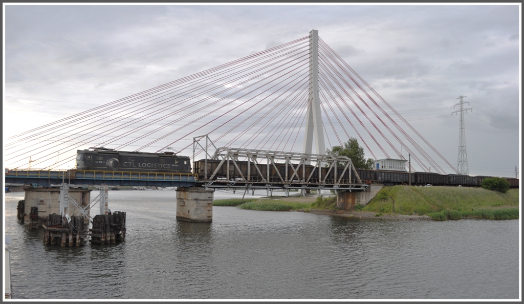 Morgens kurz vor 06.00 Uhr passieren wir ausserhalb von Gdansk/Danzig eine Eisenbahnbrücke und eine neue Autobahnbrücke. Im gleichen Moment fährt 082 052-1 von CTL Logistics mit einem Kohlezug über die Brücke. (03.06.2012)