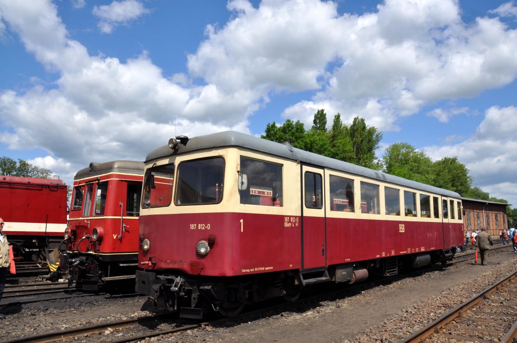 Triebwagen 187 012-0 daneben dem Triebwagen T 3 im Bw Wernigerode Westerntor-Westerntor (09.06.2012)