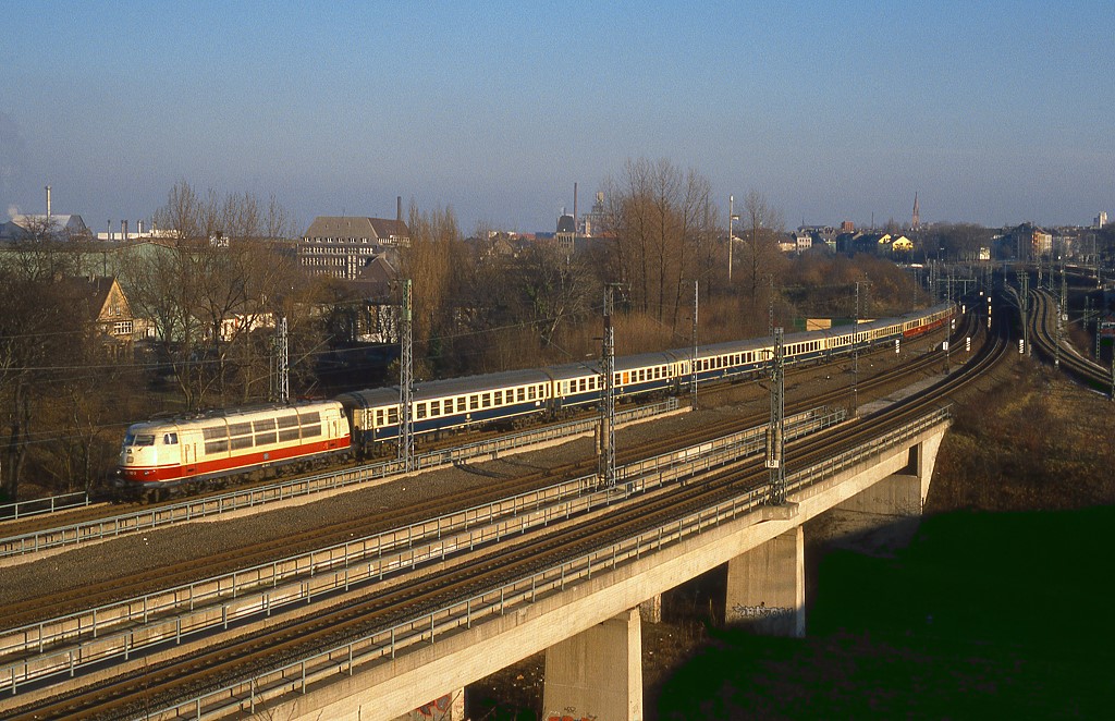 103 110 verlässt Dortmund westwärts, Aufnahme bei Dorstfeld, 24.01.1989.