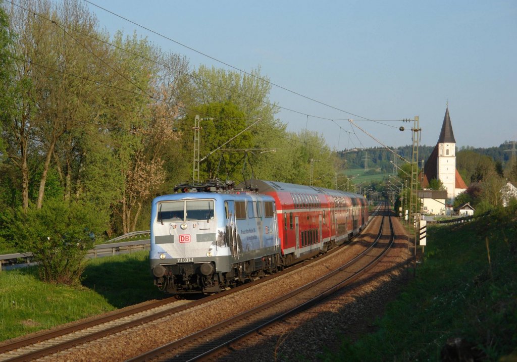 111 031 mit einem RE nach Nürnberg am 23.04.2011 unterwegs bei Hausbach.