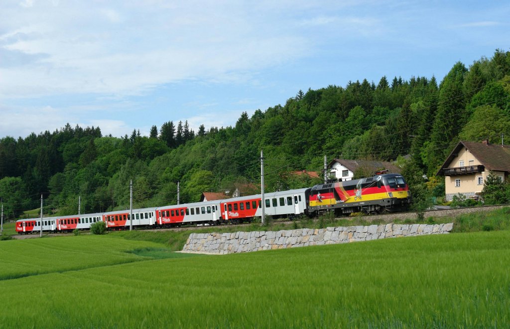 1116 036 "EM-Deutschland" mit einem REX nach Linz Hbf am 11.05.2009 unterwegs bei Wernstein am Inn.