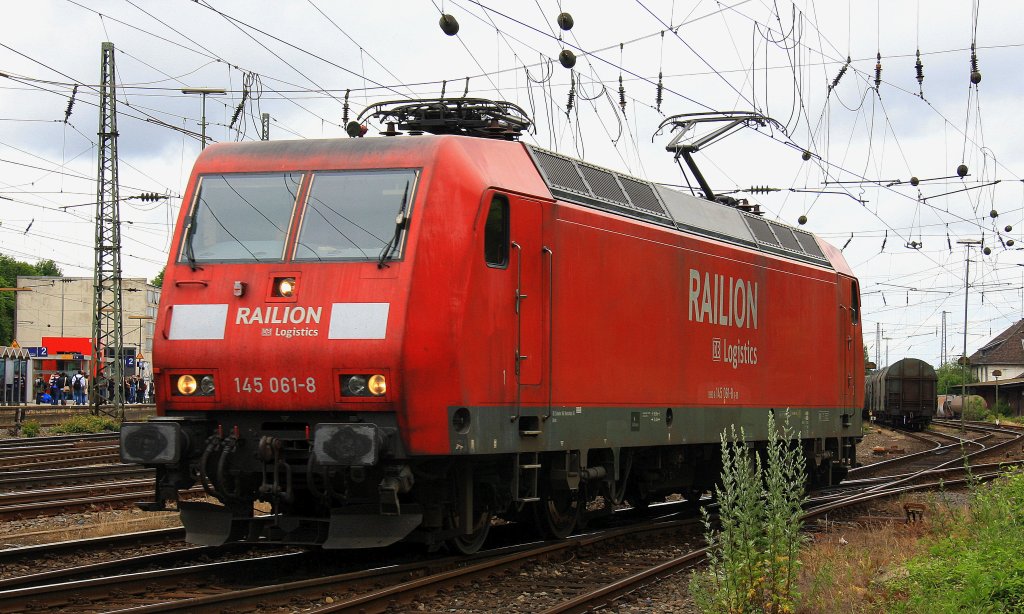 145 058-4 von Railion fährt mit einem LKW-Ambrogio-Zug aus Muizen(B) nach Gallarate(I) bei Ausfahrt in Aachen-West in Richtung Köln bei Wolken am 16.6.2012.