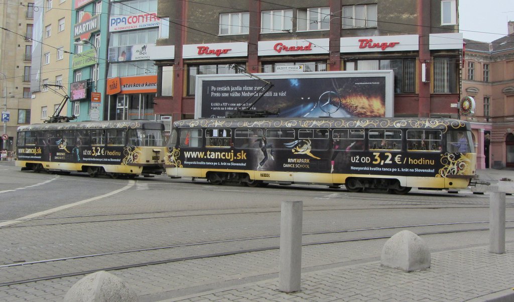 Als mein 200. Bild hier habe ich mir eine besondere Straßenbahn aus Bratislava ausgesucht! Der gold beklebte 7840 am 7.4.2012 in Bratislava. Auffällig im Hintergrund ist der Mercedesstern, durch dessen Werbeplakat die gesamte Vorderfront des Hauses verdeckt ist.