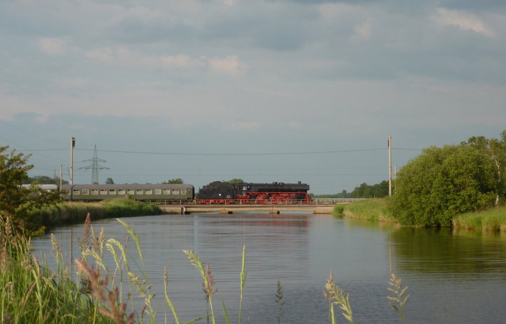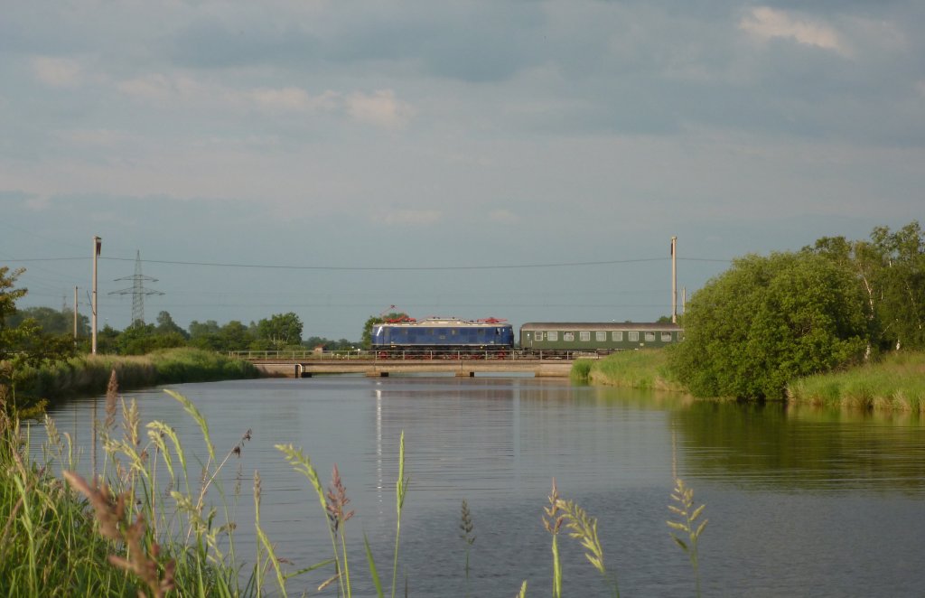 Die 03 1010 fuhr am 16.06.2012 mit einem Sonderzug von Emden über eine Kanalbrücke bei Neermoor.