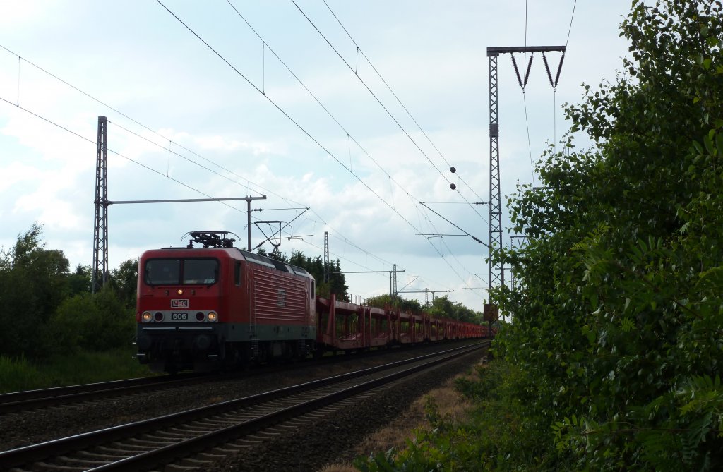 Die MEG 606 fuhr am 16.06.2012 mit einem leeren Autozug durch den alten Bahnhof Neermoor.