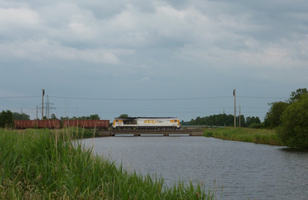 Die Voith Maxima der SGL fuhr am 16.06.2012 mit einem Kieszug über eine Kanalbrücke bei Neermoor.
