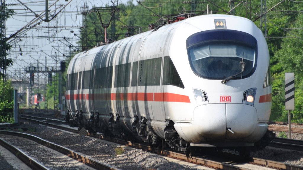 Hier links ein RE7 (RE18248) von Berlin Zoologischer Garten nach Wünsdorf-Waldstadt und rechts 808 037-6 "Neustrelitz" als ICE954 von Berlin Ostbahnhof nach Köln Hbf. mit 808 015-2 "Bitterfeld-Wolfen" als ICE944 von Berlin Ostbahnhof nach Düsseldorf Hbf., diese beiden Züge begegneten sich am 16.6.2012 in Berlin hbf.