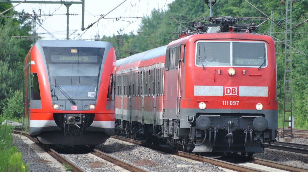Links ein Dieseltriebwagen der Baureihe 646 der  Dreieichbahn . Rechts auf dem Bild sieht man 111 097 mit einer Regionalbahn von Langen Hbf durch den Bahnhof von Dreieich-Buchschlag brausen.