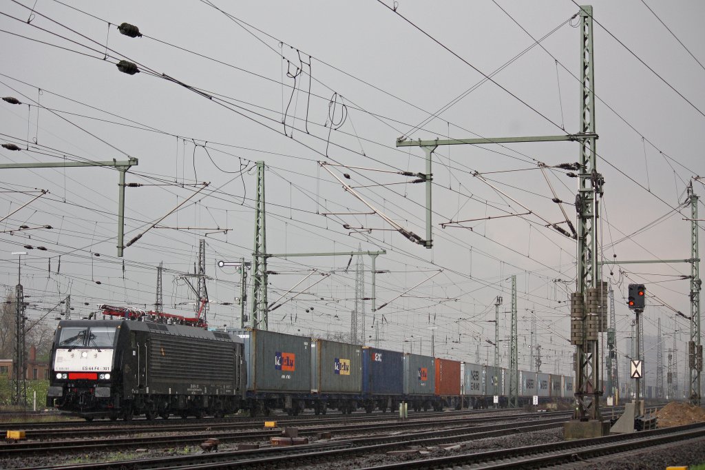 MRCE ES 64 F4-101 (i.E.für Kombiverkehr) am 12.4.12 mit einem Containerzug in Oberhausen-West.