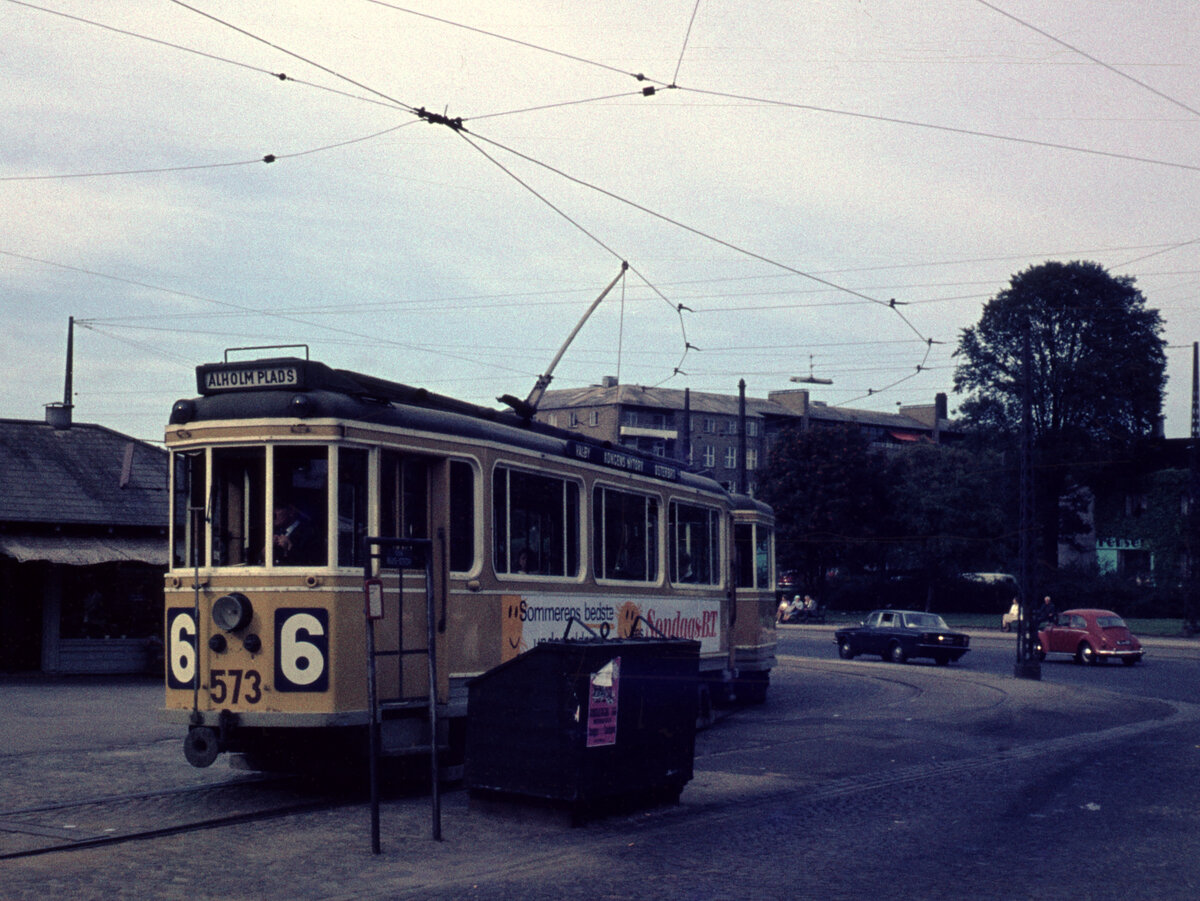 København / Kopenhagen Københavns Sporveje (KS) SL 6 (Großraumtriebwagen 573) København Ø, Østerbro, Hans Knudsens Plads im August 1968. - Scan eines Diapositivs.