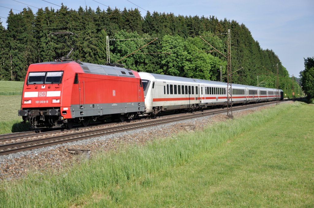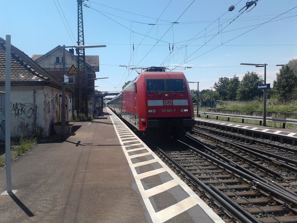 Am 28.05.2012 kam um 13:24 Uhr die 101 067-7 (ex. WM 2006 Werbelok) mit dem EC100 durch Orschweier.